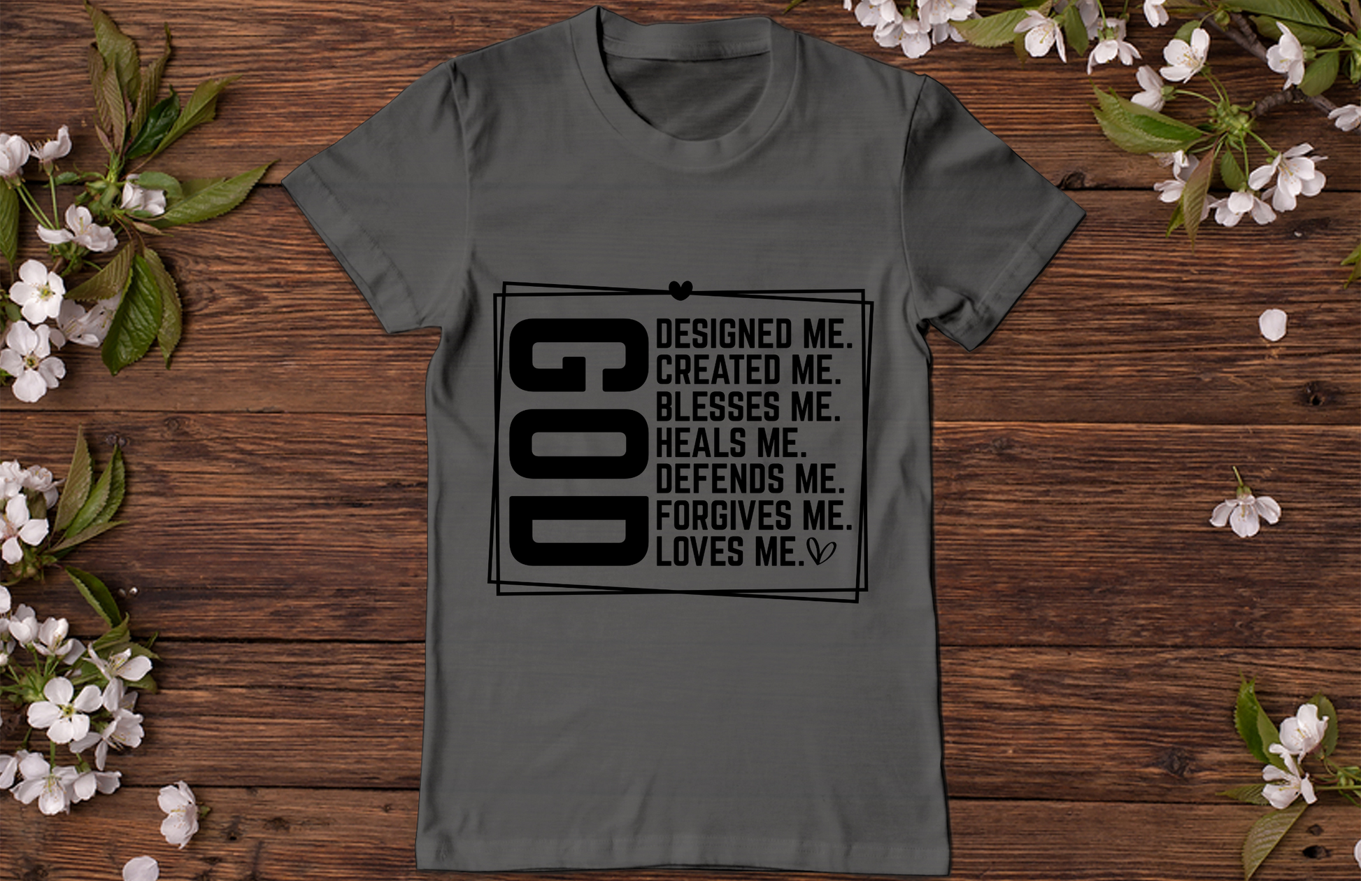 God designed, created, blesses, heals, defends, forgives, and loves me! What a great reminder shirt to wear around as you go about your day!