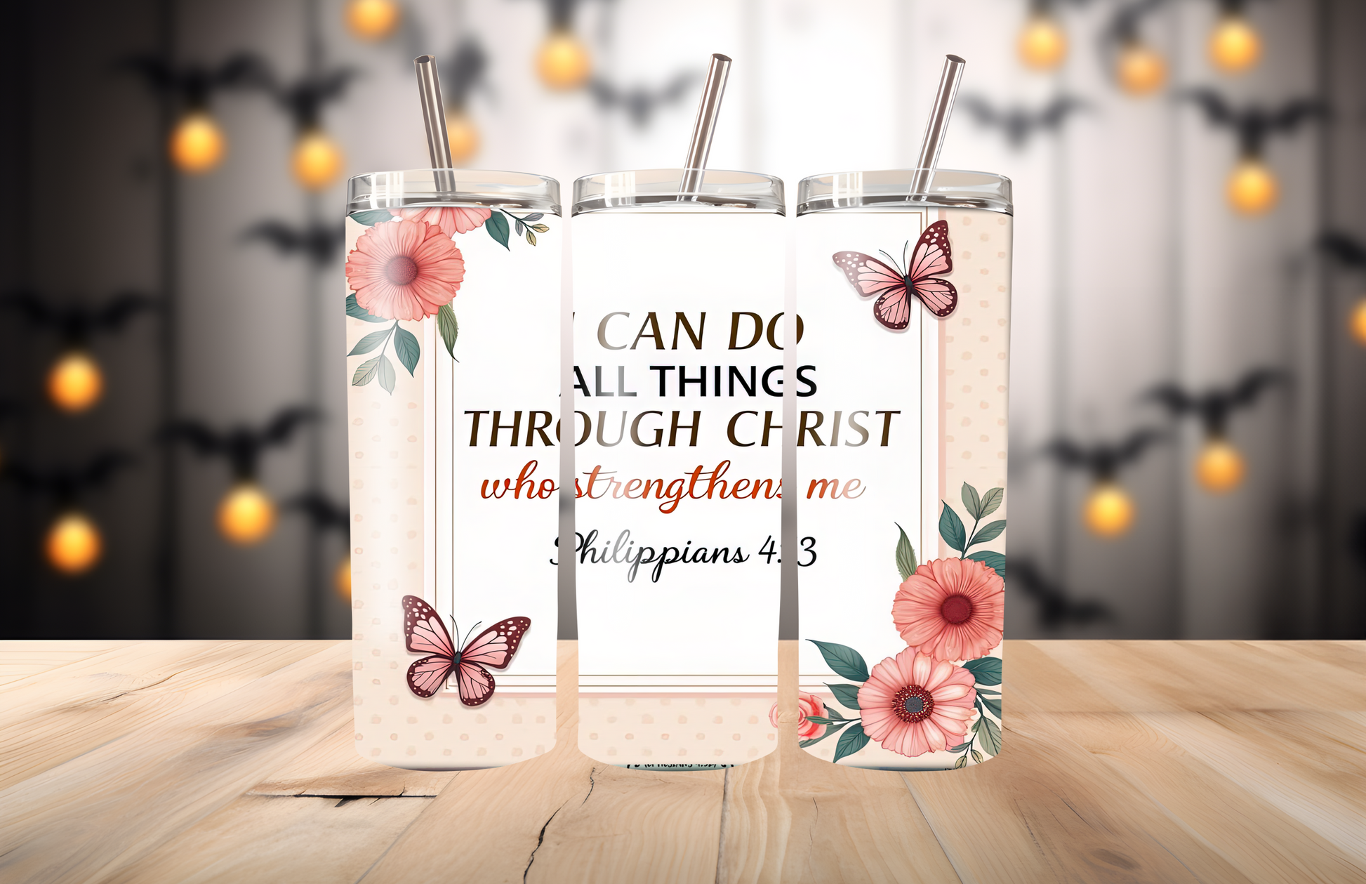 This beautiful butterfly and floral tumbler with Philippians 4:13 on it would make a great gift for the woman of God in your life.